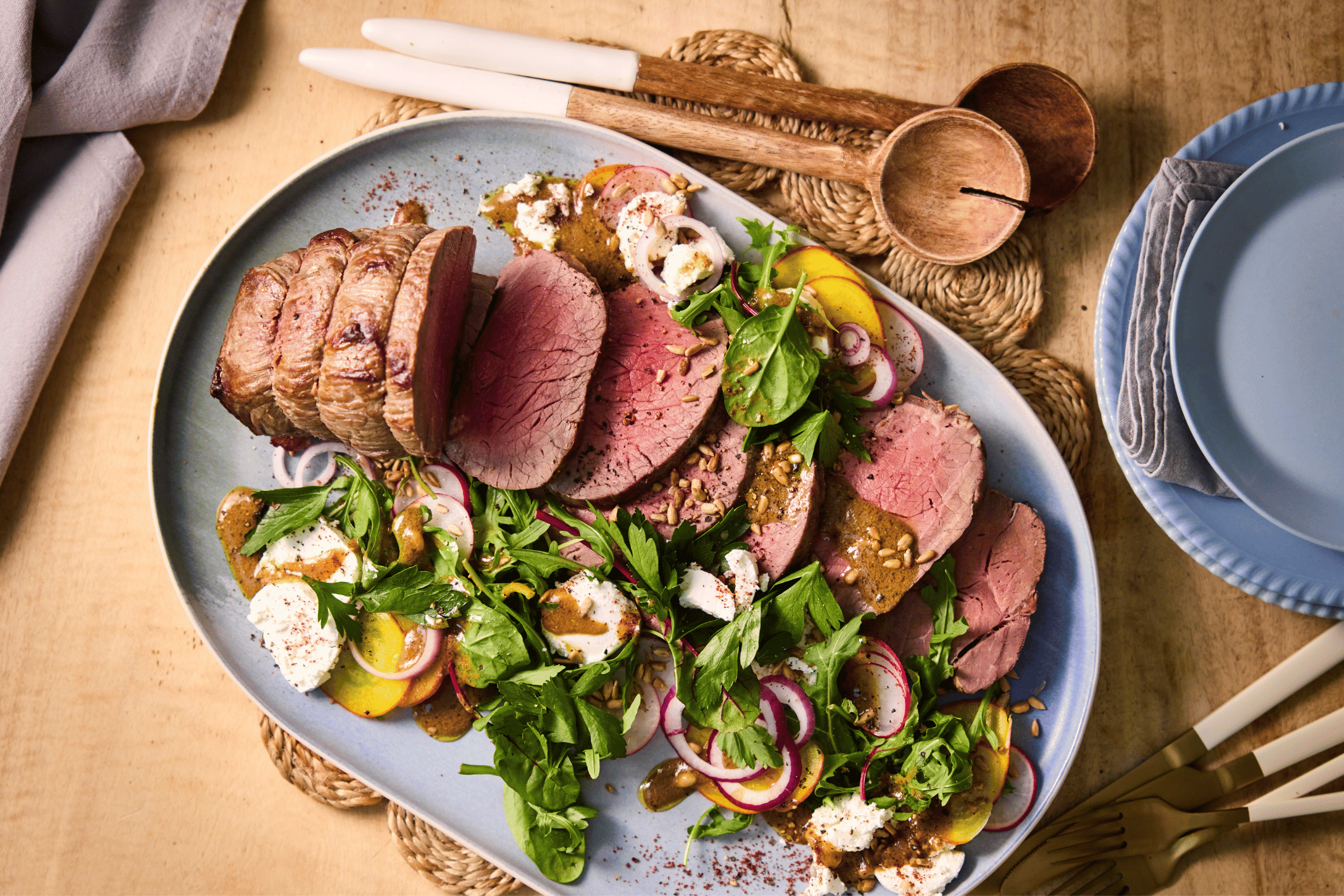 Slice cooked and cooled Harvey Beef Garlic & Rosemary Marinated Rump into 1.5cm thick slices (or to your liking) and lay out on a large platter. Scatter the remaining ingredients in and around the beef then dress.